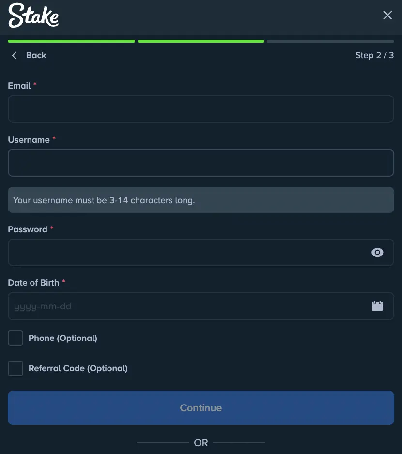 To register manually, enter your email and create your username. Create your password and enter your date of birth. You can also add your phone number and referral code, especially if you found us through an affiliate website. Go to the next page and read our terms. Tick the box to confirm that you agree with casino online Stake terms of use. Submit your form.