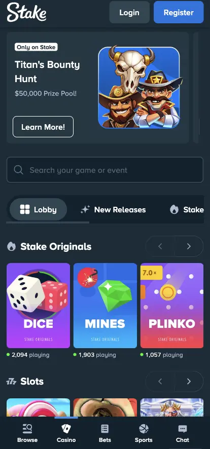 Sign-up and log-in buttons appear at the top, next to our logo. You will find a banner showing current offers below the header. The search bar appears below the banner. You can search for titles. The search bar is followed by tabs, including lobby, slots and live casino. Users can scroll on the interface to find games. You will find several sections and < > signs to help you explore the section. Stake app also has a footer section, where you will find the licensing details, terms of use and other information.