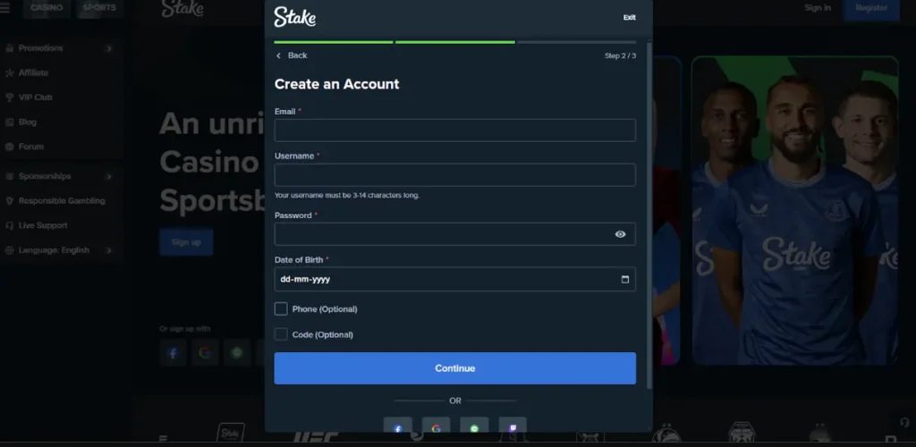 There are two Stake sign up processes. One uses a social media profile, while the other follows manual steps. We recommend the second one because it allows you to provide accurate information that will match the documents you will provide during verification.