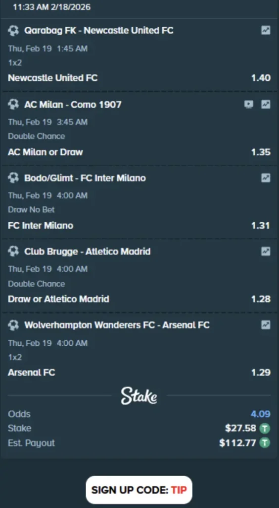 Champions League betting runs from qualifying rounds to the final, with group stage outrights, individual match markets and in-play wagering. Football accumulators can combine selections across different leagues into a single slip. FIFA tournaments, including World Cup qualifiers and the Club World Cup, are fully covered. All markets on Stake betting support cryptocurrency wagering; deposits in BTC, ETH, or any supported coin are converted to your balance currency at the current rate. Odds margins on top football average 3–4%.